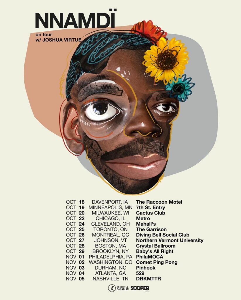 The North American tour consisting of 15-stops will kick off on Tuesday, October 18 in Davenport, Iowa at The Raccoon Motel. Rising alternative rapper Joshua Virtue will join NNAMDÏ as official support for the entirety of the tour with guest appearances by Moontype, Daphne Jane, Thanya Iyer, Alicia Walter, Pink Navel, Twelve25, Volunteer Department, Green Apples, and Sunguh.